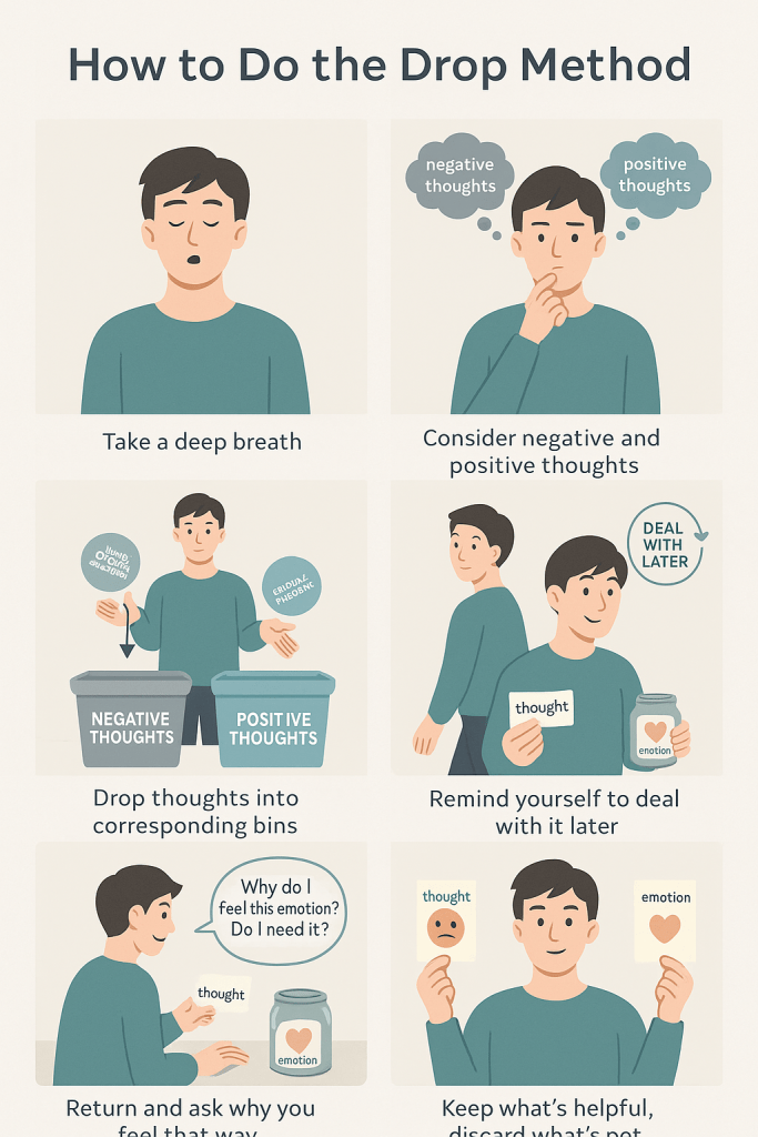 The Drop Method is a simple, life-saving emotional triage technique you can use anytime—no therapy degree required. Just breathe, sort, and release. 🫧
